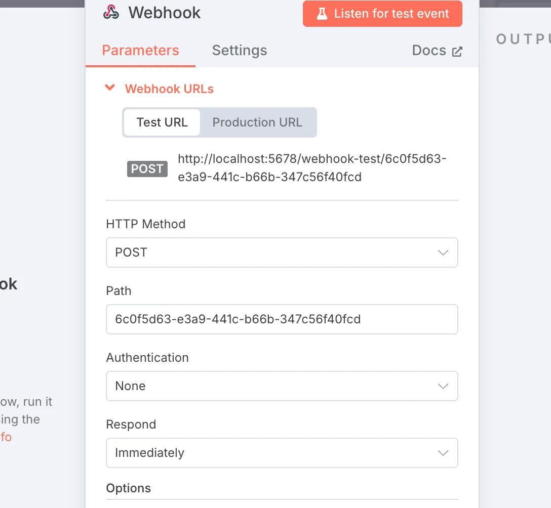 选择webhook类型接收节点,post类型,Authentication可以先不配置,选择None。